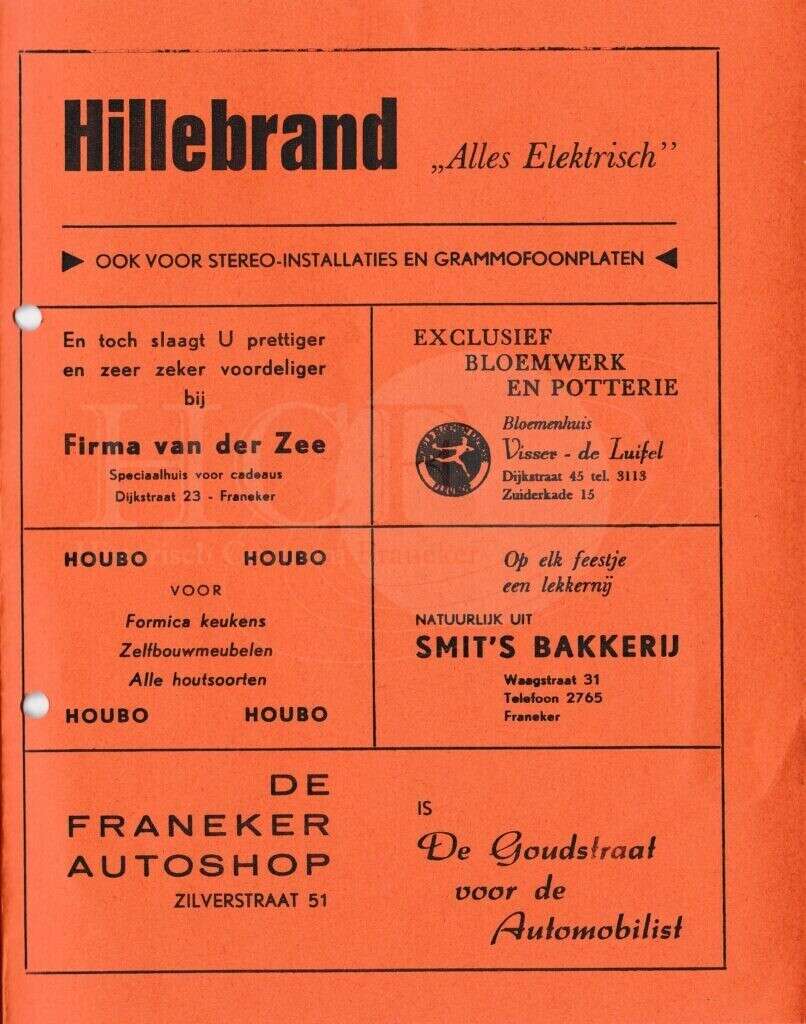 Beschrijving:It Fleurige Flittergat: 1970 6de jaargang nr. 8: Reklame: Hillebrand "Alles Electrisch" Dijkstraat 25, Firma Van der Zee cadeau's Dijkstraat 23, Bloemenhuis Visser-de Luifel Dijkstraat 45. HOUBO keueken en zelfbouw meubelen, Smid's Bakkerij Waagstraat 31, De Franeker autoshop Automaterialen Zilverstraat 51.