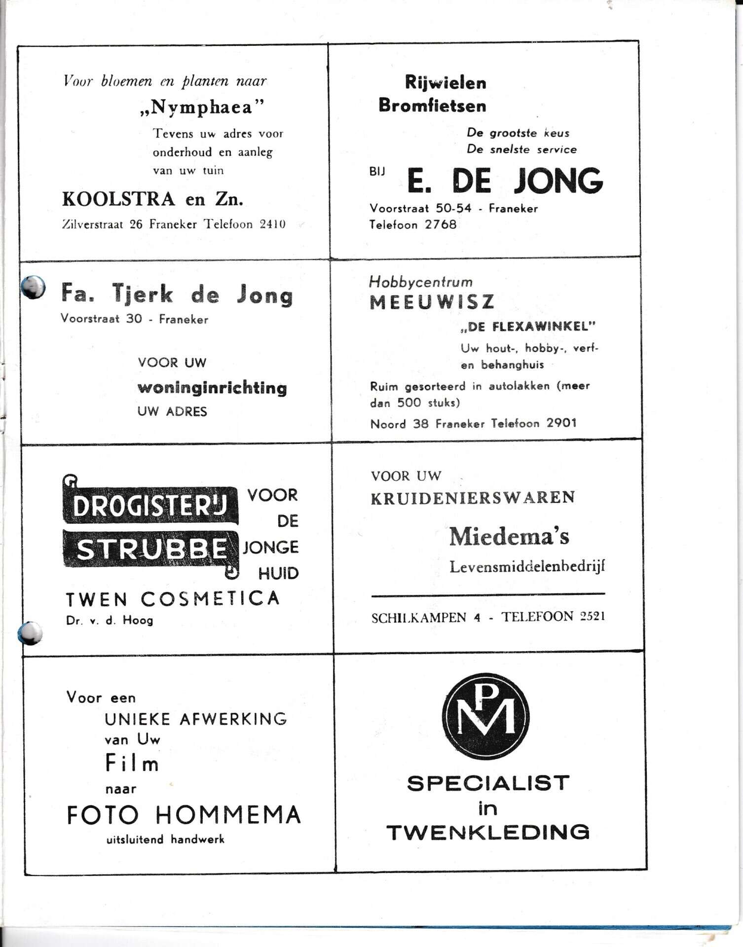 Beschrijving: | It Fleurige Flittergat: 1970 6de jaargang nr. 9: Reklame: Bloemenhuis "Nymphaea" Zilverstraat 26 , E. de Jong Rijwielen Voorstraat 50-54, Woninginrichting Tjerk de Jong Voorstraat 30, de Flexawinkel Noord 38, Droogisterij Strubbe Noord, Miedema's levensmiddelen Schilcampen 4, Foto Hommema Zilverstraat 1, PM Breedeplaats 12. |