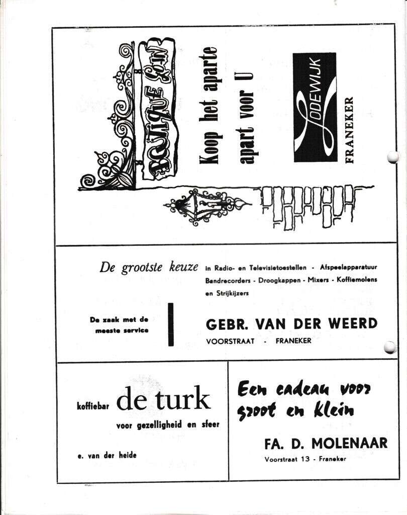 Beschrijving: | It Fleurige Flittergat: 1970 6de jaargang nr. 10: Reklame; Lodewijk Textiel en kleding Voorstraat 5,23 en 34, Gebr. Van der Weert Voorstraat 25, Koffiebar De Turk, Fa.D. Molenaar Voorstaat 13 |