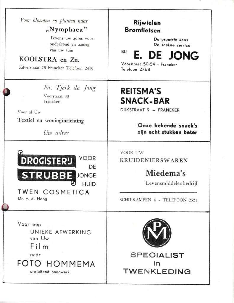 Beschrijving: | It Fleurige Flittergat: 1970 7de jaargang nr. 3: Reklame: Bloemenhuis "Nymphaea" Zilverstraat 26 , E. de Jong Rijwielen Voorstraat 50-54, Woninginrichting Tjerk de Jong Voorstraat 30, Reitsma's snackbar Dijkstraat 9, Droogisterij Strubbe Noord 32, Miedema's levensmiddelen Schilcampen 4, Foto Hommema Zilverstraat 1, PM Breedeplaats 12. |