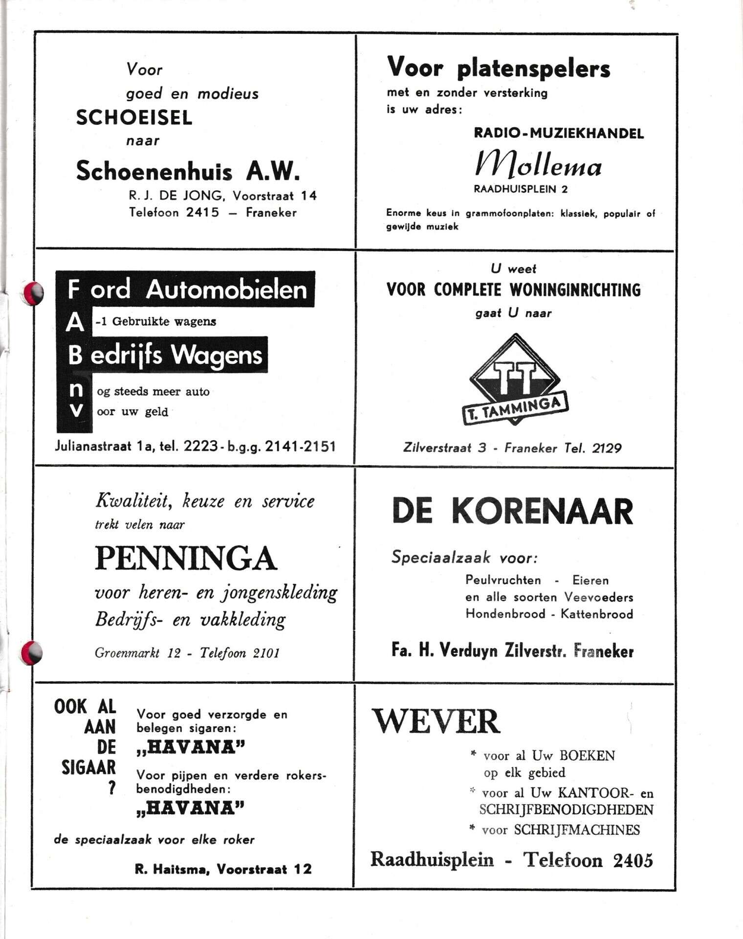 Beschrijving:It Fleurige Flittergat: 1970 7de jaargang nr. 3: Reklame: R.J. de Jong, Schoenenhuis A.W Voorstraat 14, Radio-muziekhandel Mollema Raadhuisplein 2 , F.A.B Julianastraat 1, Woninginrichting T.Tamminga Zilverstraat 3, Herenmode Penninga Groenmarkt 12, De Korenaar, zilverstraat 58, Sigarenmagazijn"Havana" K.Sijtsma Voorstraat 12, Boekhandel Wever Raadhuisplein 4