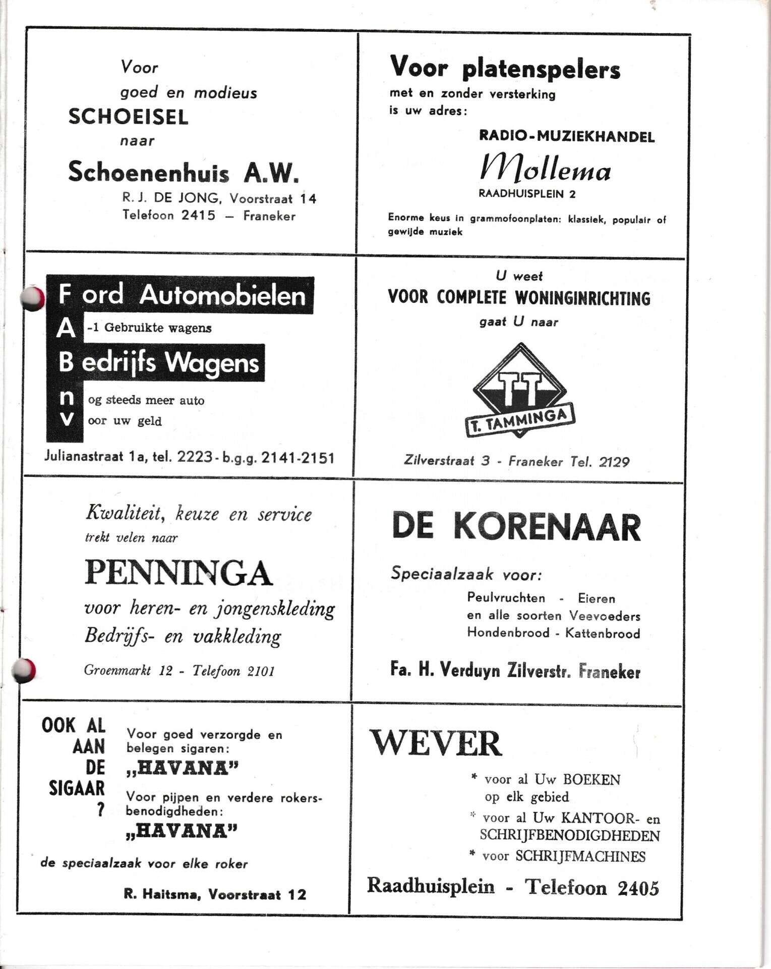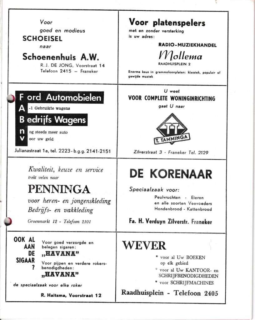 Beschrijving: | It Fleurige Flittergat: 1971 7de jaargang nr. 4: Reklame: R.J. de Jong, Schoenenhuis A.W Voorstraat 14, Radio-muziekhandel Mollema Raadhuisplein 2 , F.A.B Julianastraat 1, Woninginrichting T.Tamminga Zilverstraat 3, Herenmode Penninga Groenmarkt 12, De Korenaar, zilverstraat 58, Sigarenmagazijn"Havana" K.Sijtsma Voorstraat 12, Boekhandel Wever Raadhuisplein 4 |