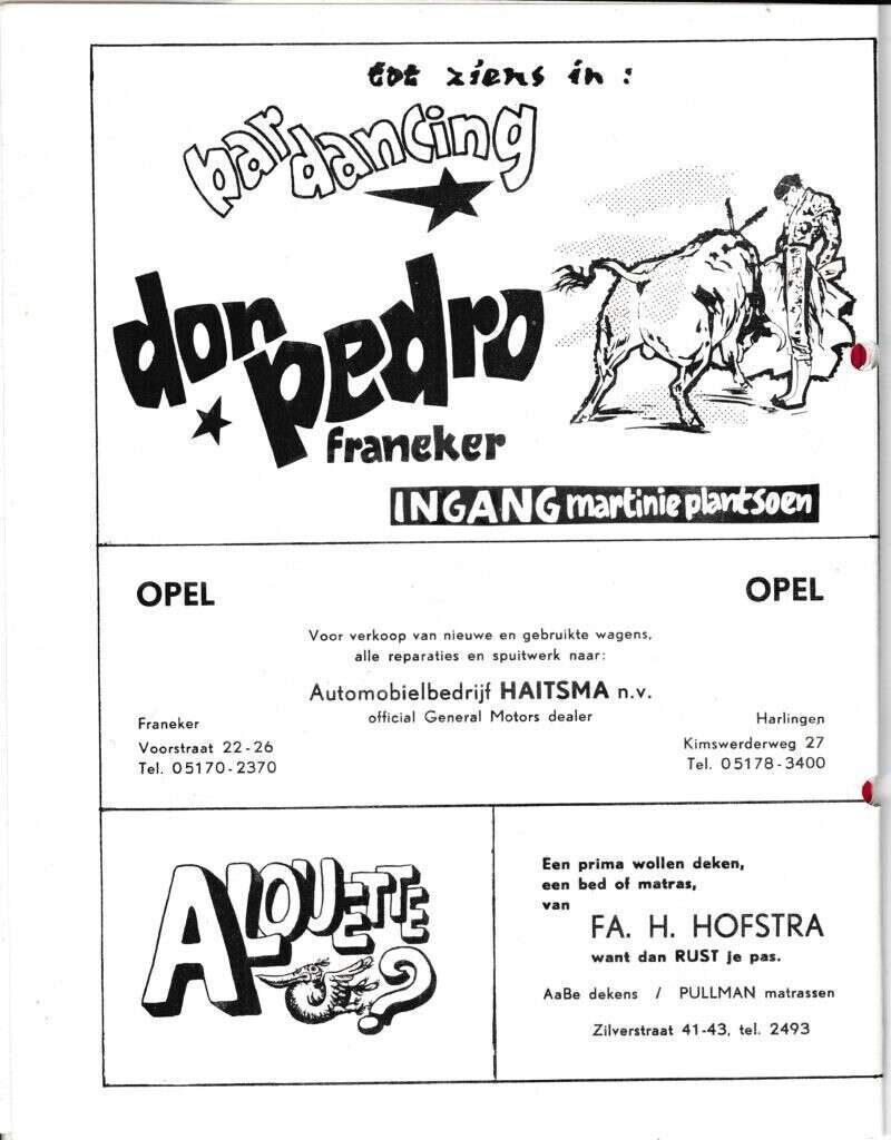 Beschrijving: | It Fleurige Flittergat: 1971 7de jaargang nr. 4: Reklame: Don Pedro Martinplantsoen, Automobielbedrijf Haitsma Voorstraat 20-22, Bar Alouette Schilcampen 1, fa. H.Hofstra huis stoffeering Zilverstraat 41-43 |