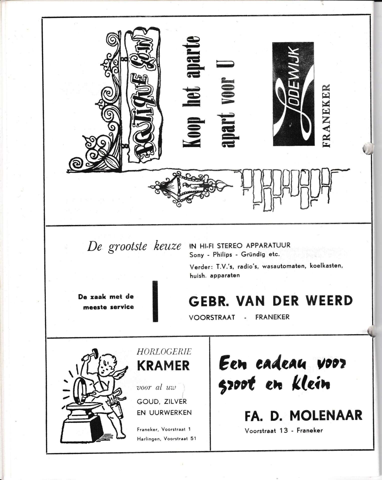 Beschrijving:It Fleurige Flittergat: 1971 7de jaargang nr. 4: Reklame; Lodewijk Textiel en kleding Voorstraat 5,23 en 34, Gebr. Van der Weert Voorstraat 25, Horlogerie Kramer, Voorstraat 1 , Fa.D. Molenaar Voorstaat 13
