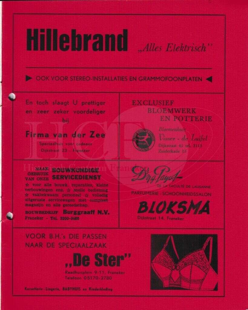 Beschrijving: | It Fleurige Flittergat: 1971 7de jaargang nr. 4: Reklame: Hillebrand "Alles Electrisch" Dijkstraat 25, Firma Van der Zee cadeau's Dijkstraat 23, Bloemenhuis Visser-de Luifel Dijkstraat 45. Bouwbedrijf Burggraaf, Parfumerie Bloksma Dijkstraat 14, Speciaalzaak "De Ster" Raadhuisplein 9-11 |