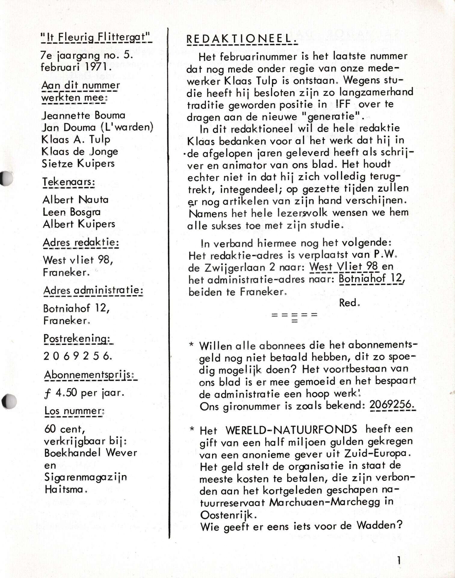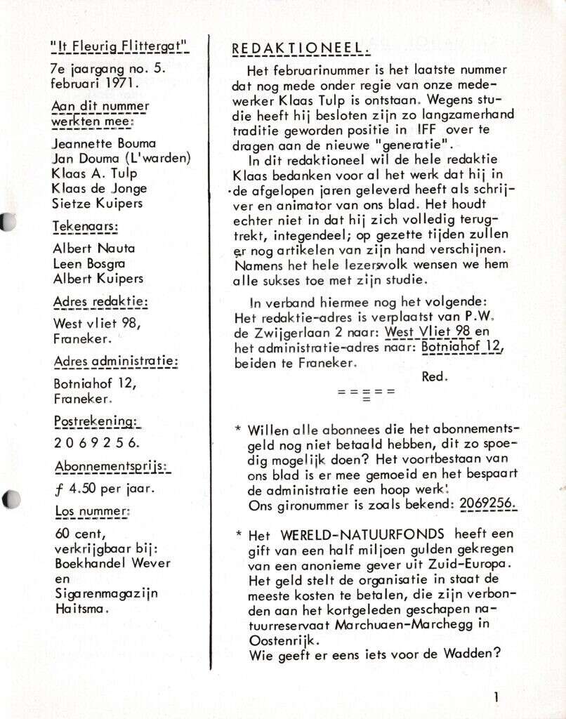 Beschrijving:It Fleurige Flittergat: 1971 7de jaargang nr. 5: Redactioneel: afscheid Klaas Tulp