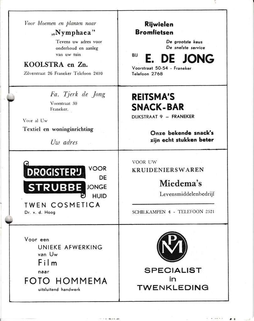 Beschrijving:It Fleurige Flittergat: 1971 7de jaargang nr. 6: Reklame: Bloemenhuis "Nymphaea" Zilverstraat 26 , E. de Jong Rijwielen Voorstraat 50-54, Woninginrichting Tjerk de Jong Voorstraat 30, Reitsma's snackbar Dijkstraat 9, Droogisterij Strubbe Noord 32, Miedema's levensmiddelen Schilcampen 4, Foto Hommema Zilverstraat 1, PM Breedeplaats 12.