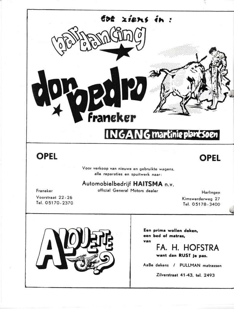 Beschrijving:It Fleurige Flittergat: 1971 7de jaargang nr. 6: Reklame: Don Pedro Martinplantsoen, Automobielbedrijf Haitsma Voorstraat 20-22, Bar Alouette Schilcampen 1, fa. H.Hofstra huis stoffeering Zilverstraat 41-43