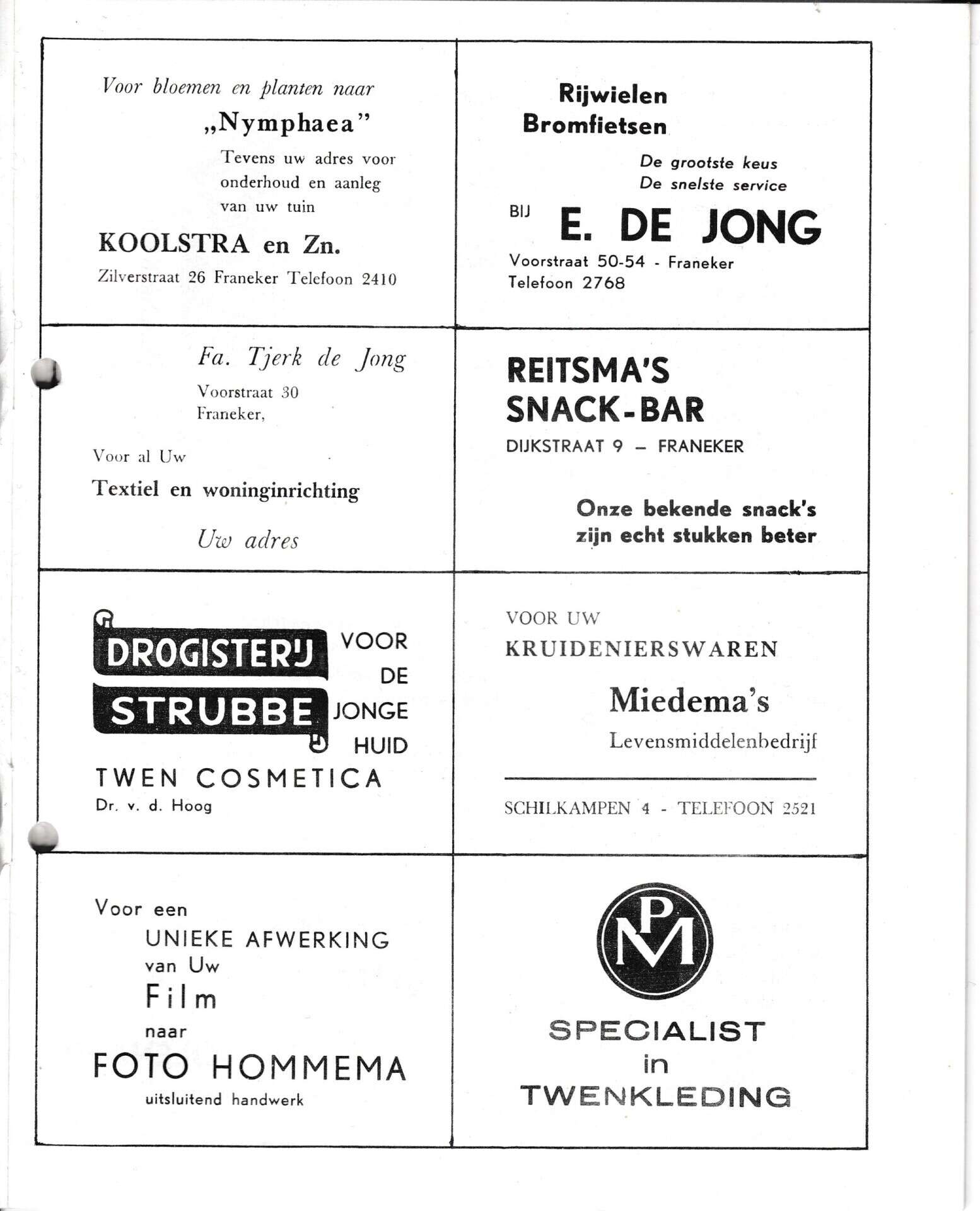 Beschrijving:It Fleurige Flittergat: 1971 7de jaargang nr. 7: Reklame: Bloemenhuis "Nymphaea" Zilverstraat 26 , E. de Jong Rijwielen Voorstraat 50-54, Woninginrichting Tjerk de Jong Voorstraat 30, Reitsma's snackbar Dijkstraat 9, Droogisterij Strubbe Noord 32, Miedema's levensmiddelen Schilcampen 4, Foto Hommema Zilverstraat 1, PM Breedeplaats 12.