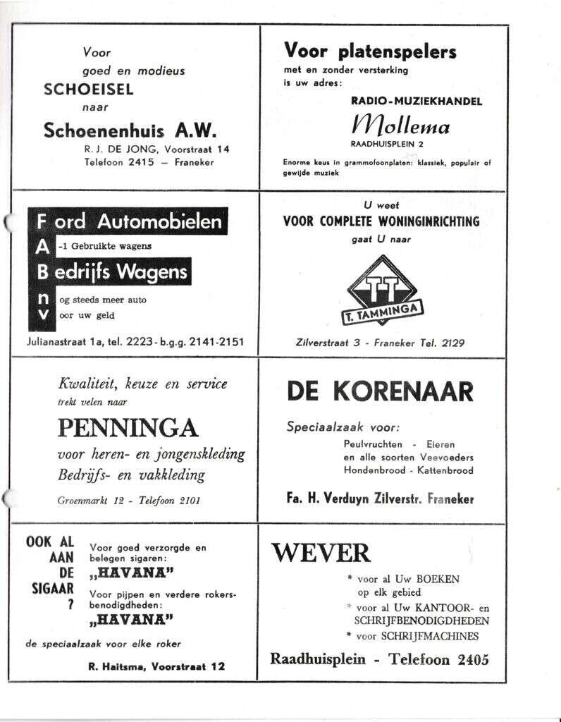 Beschrijving: | It Fleurige Flittergat: 1971 7de jaargang nr. 7: Reklame: R.J. de Jong, Schoenenhuis A.W Voorstraat 14, Radio-muziekhandel Mollema Raadhuisplein 2 , F.A.B Julianastraat 1, Woninginrichting T.Tamminga Zilverstraat 3, Herenmode Penninga Groenmarkt 12, De Korenaar, zilverstraat 58, Sigarenmagazijn"Havana" K.Sijtsma Voorstraat 12, Boekhandel Wever Raadhuisplein 4 |