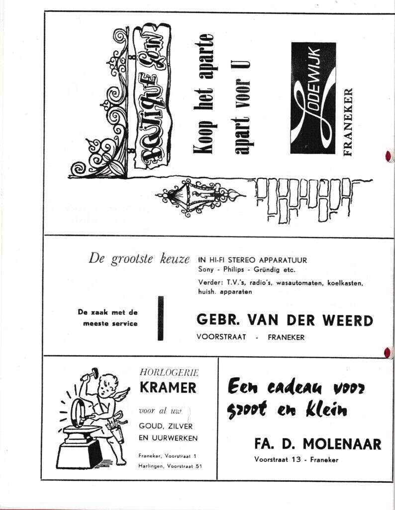 Beschrijving: | It Fleurige Flittergat: 1971 7de jaargang nr. 8: Reklame; Lodewijk Textiel en kleding Voorstraat 5,23 en 34, Gebr. Van der Weert Voorstraat 25, Horlogerie Kramer, Voorstraat 1 , Fa.D. Molenaar Voorstaat 13 |