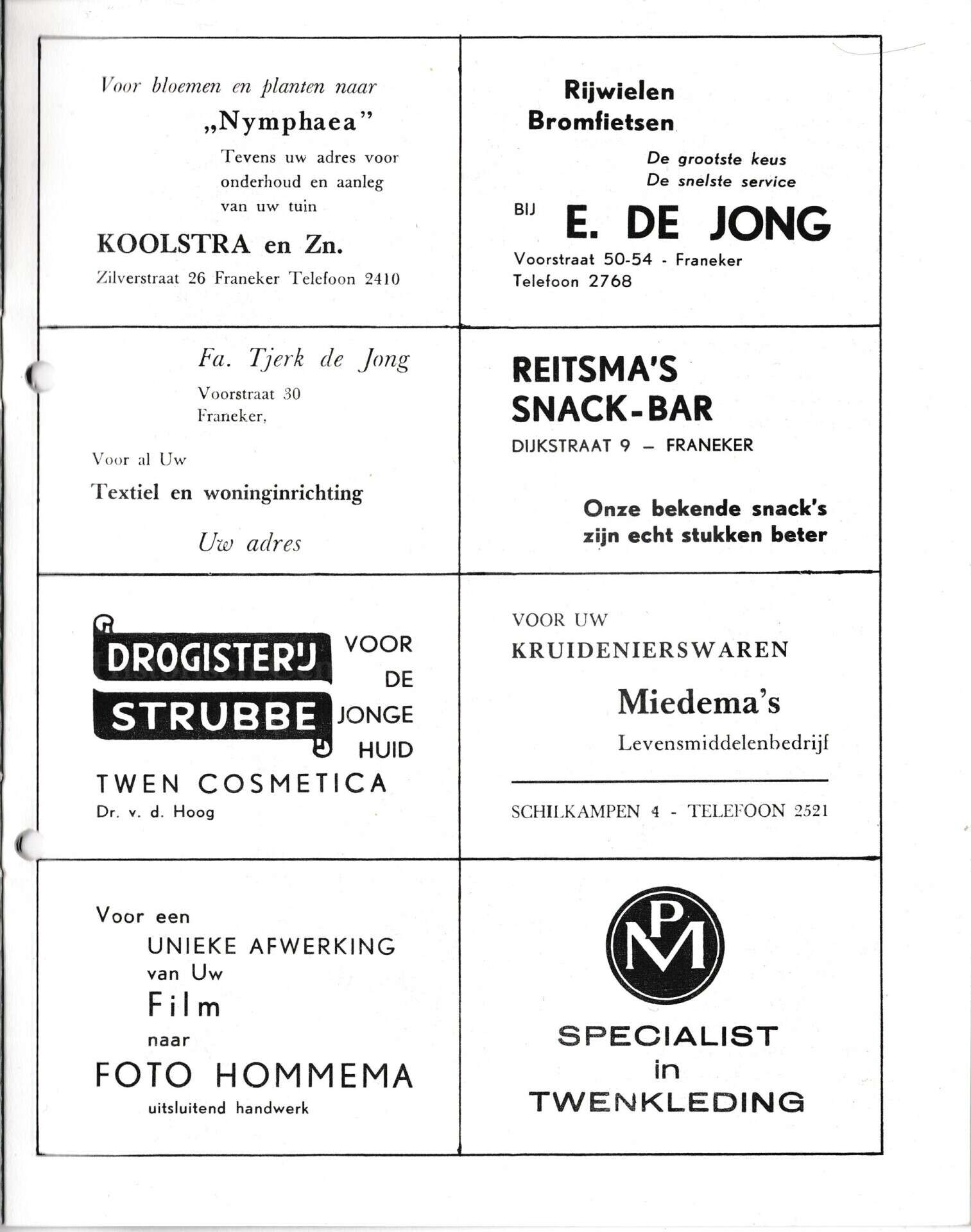Beschrijving: | It Fleurige Flittergat: 1971 7de jaargang nr. 9: Reklame: Bloemenhuis "Nymphaea" Zilverstraat 26 , E. de Jong Rijwielen Voorstraat 50-54, Woninginrichting Tjerk de Jong Voorstraat 30, Reitsma's snackbar Dijkstraat 9, Droogisterij Strubbe Noord 32, Miedema's levensmiddelen Schilcampen 4, Foto Hommema Zilverstraat 1, PM Breedeplaats 12. |