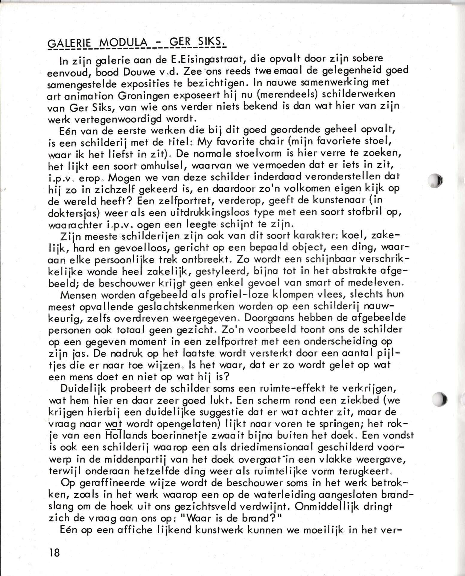 Beschrijving: | It Fleurige Flittergat: 1971 7de jaargang nr. 9: Galerie MODULA ( Douwe van der Zee ). |