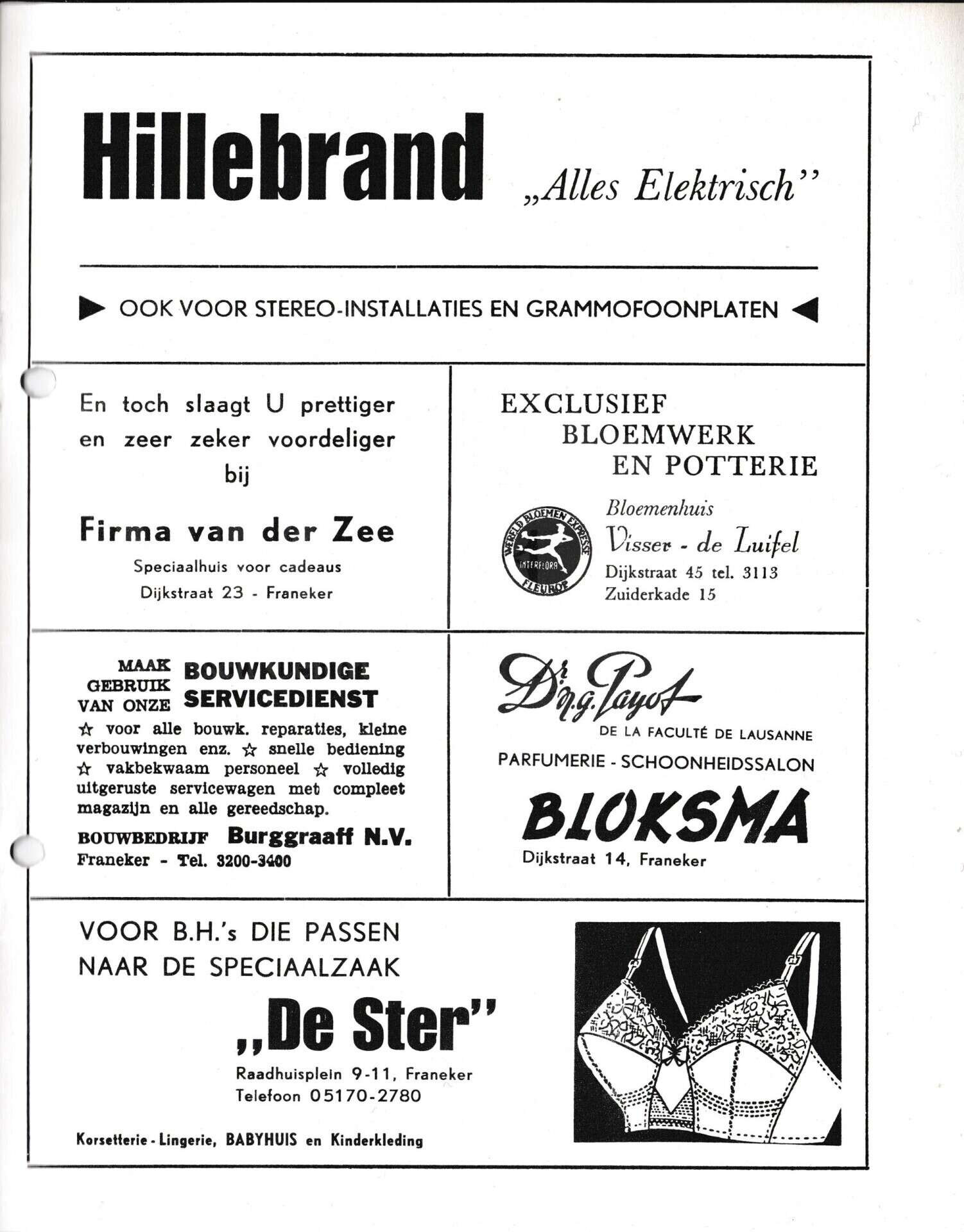 Beschrijving:It Fleurige Flittergat: 1971 7de jaargang nr. 9: Reklame: Hillebrand "Alles Electrisch" Dijkstraat 25, Firma Van der Zee cadeau's Dijkstraat 23, Bloemenhuis Visser-de Luifel Dijkstraat 45. Bouwbedrijf Burggraaf, Parfumerie Bloksma Dijkstraat 14, Speciaalzaak "De Ster" Raadhuisplein 9-11