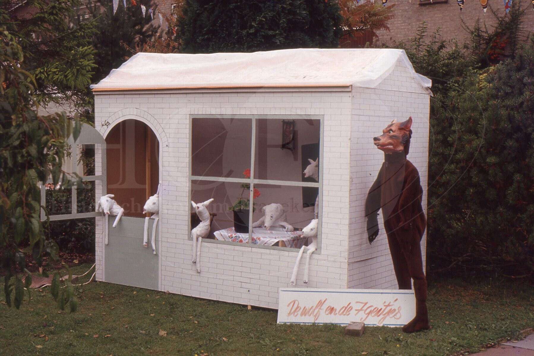 Beschrijving:Agrarische dagen F6 200 jaar Planetarium. Versierde straat met de Wolf en de 7 geitjes