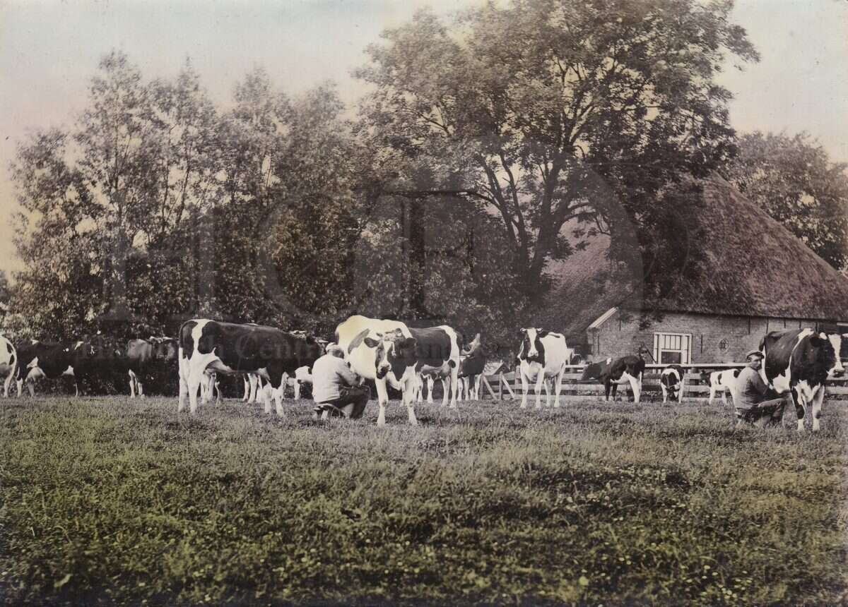 | Beschrijving: | Boerderij met boer die koeien melkt |