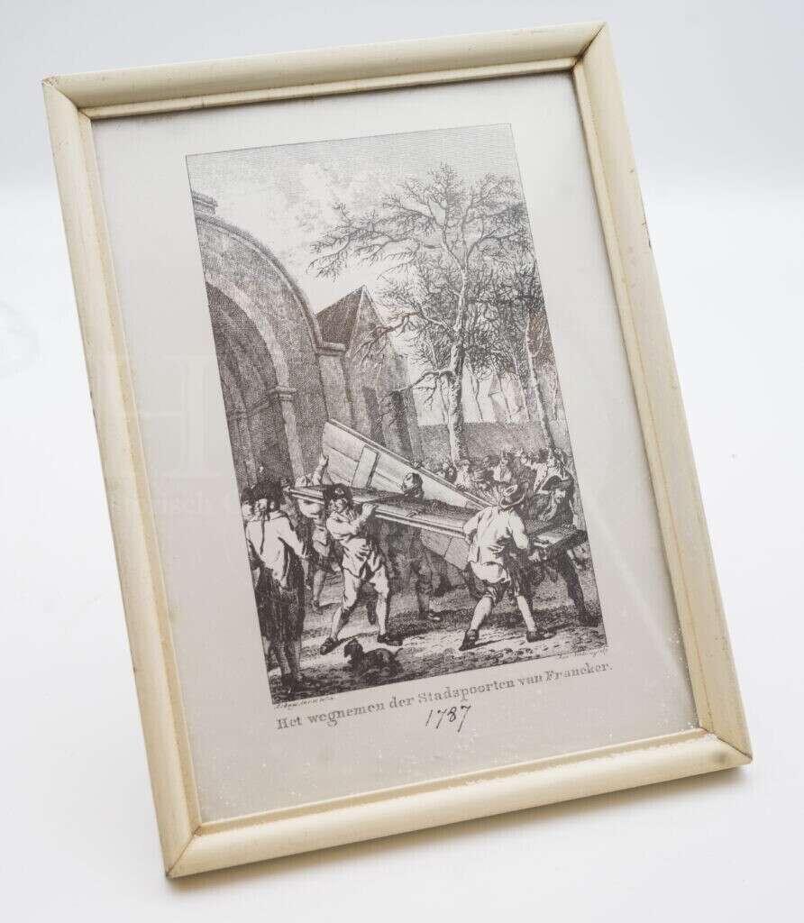 Beschrijving: | Fotolijstje met een tekening van het weghalen van de stadpoorten 1786 |