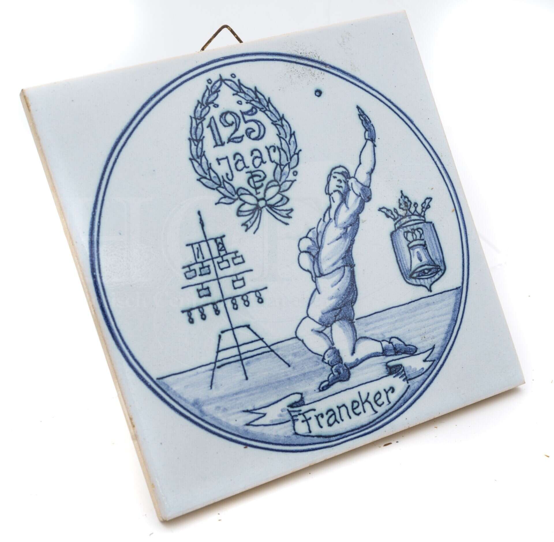 Beschrijving: | Tegeltje met een afbeelding van een kaatser en een telegraaf (125 jaar) |