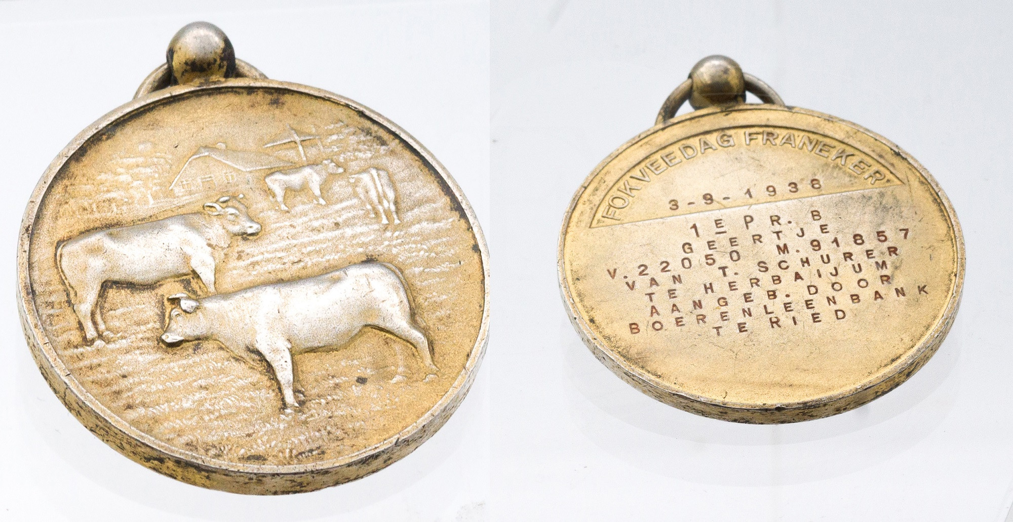 Beschrijving:Medaille voor de 1ste prijs van koe Geertje van T. ( Tunno ) Schurer uit Herbaijum op Fokveedag in 1938 in Franeker