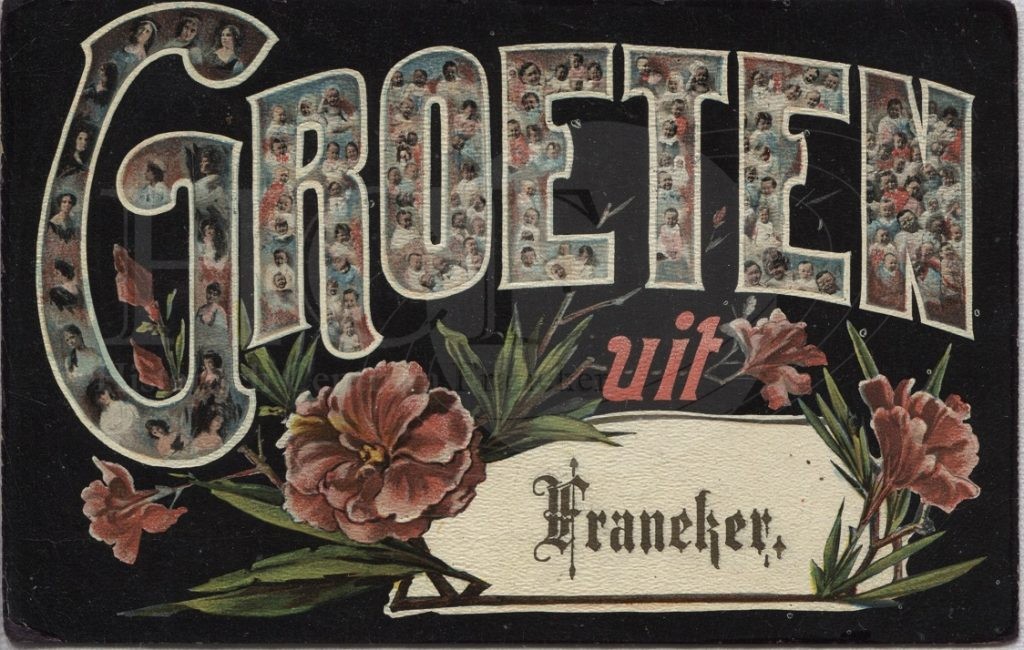 | Beschrijving: | Groeten uit Franeker; het woord groeten is gevuld met portretten, en staan bloemen op. |
