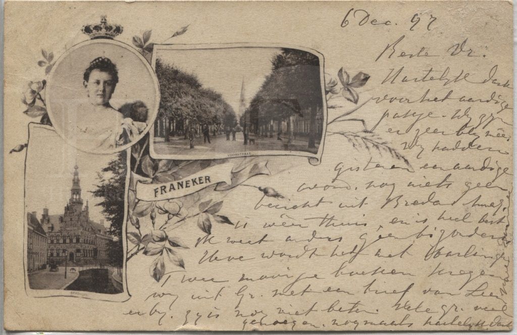 | Beschrijving: | Een foto van Koningin Wilhelmina met twee foto's van de voorstraat en van het stadhuis. |