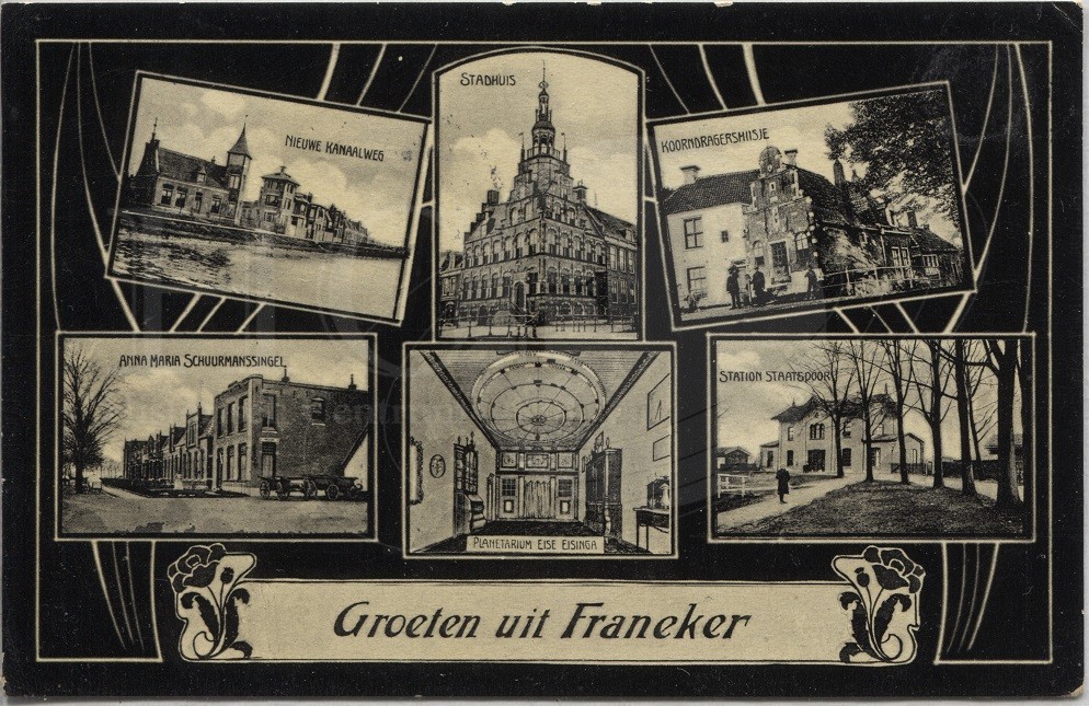 Beschrijving:Groeten uit Franeker; Art nouveau kaart met 6 foto's van het nieuwe kanaal, het stadhuis, het Korendraagershuisje, De Anna Maria van Schurmansingel, het planetarium van Eise Eisinga, en het treinstation.