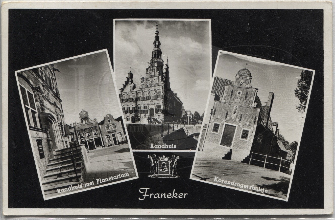 Beschrijving:Franeker; kaart met 3 foto's van het planetarium van Eise Eisinga, het stadhuis en het Korendraagershuisje,
