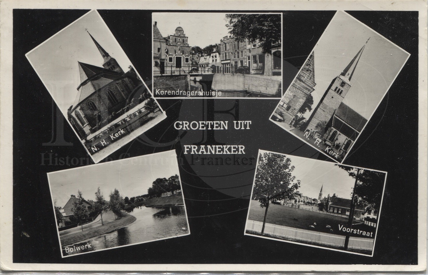 | Beschrijving: | Groeten Franeker; kaart met 5 foto's van de Martinkerk, het korendragershuisje, de Breedeplaats, de Ypeysingel en de Voorstraat |