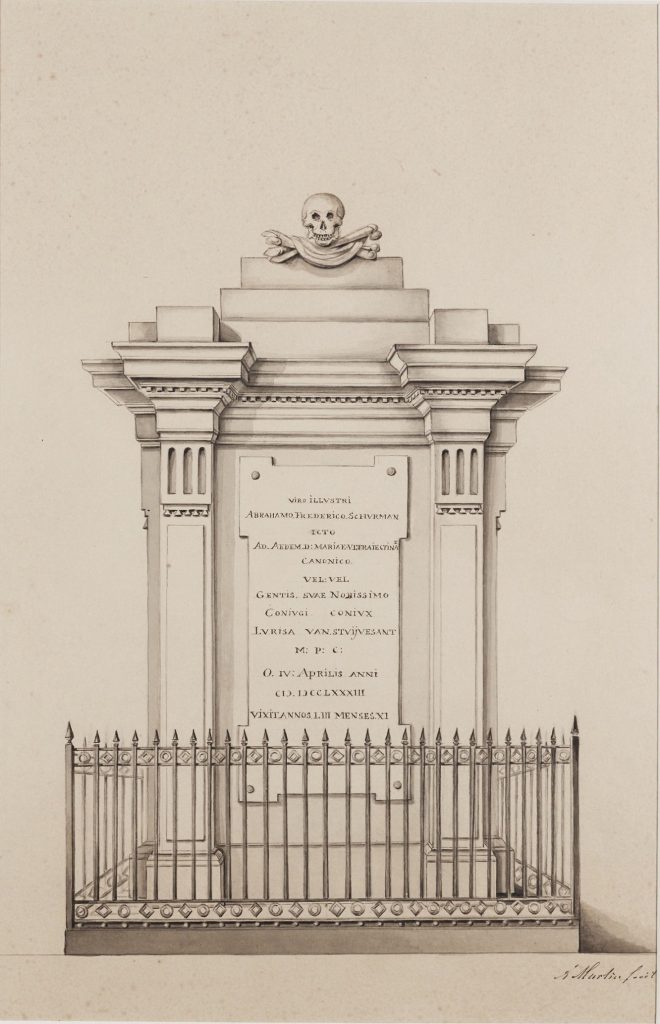 Zerk 1 (gedenksteen) Viro illustri Voor de voortreffelijke man ABRAHAHMO FREDERICO SCHURMAN Abraham Frederik van Schurman Icto Kanunnik van de Ad Aedem D. Mariae Ultraiectinae Mariakerk te Utrecht Canonici. De laatste van zijn geslacht vel. vel. Gentis suae norissimo De steen geplaatst door coniugi coniux zijn vrouw LURIDA VAN STUIJVESANT Louisa van Stuijvesant M.P.C. Overleden … Zerk 1