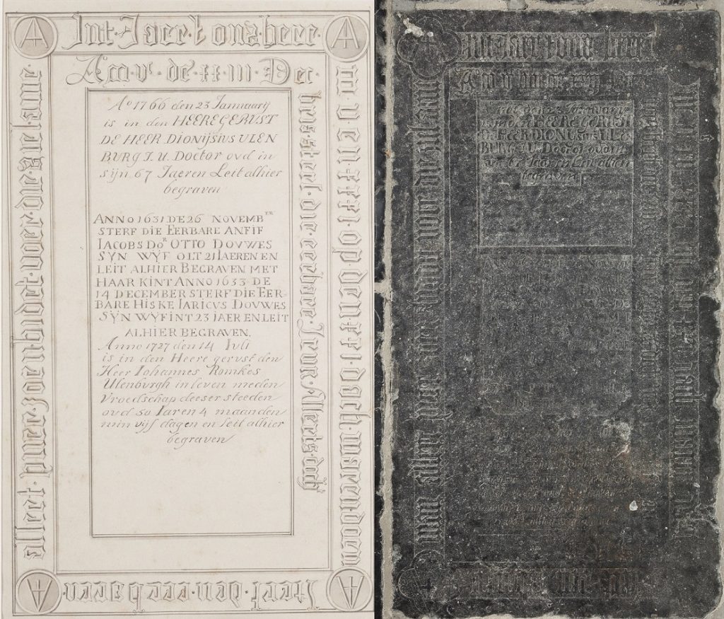 Zerk 102 Op de zerk is een dubbel randschrift aangebracht in Gotische letters. De tekst op het middenvlak is niet erg duidelijk, maar na enig puzzelwerk is het te lezen. Het randschrift op de buitenrand is: Int jaer ons Here M Vc en XXXI op den XXI dach Martii doen sterf den Eerbare man Allert … Zerk 102