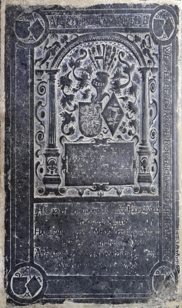 Zerk 103 De tekst van deze zerk is erg afgesleten. Dit in tegenstelling met het fraaie beeldhouwwerk dat ongeschonden is. Het randschrift is goed te lezen, maar de tekst in het beeldhouwwerk minder goed. Het randschrift is: Ao 1623 de’ 21 Iuny sterf de’ Welgeleerd’ Jacobus Rodrigius de Becker olt int 38 iaer Tekst op … Zerk 103