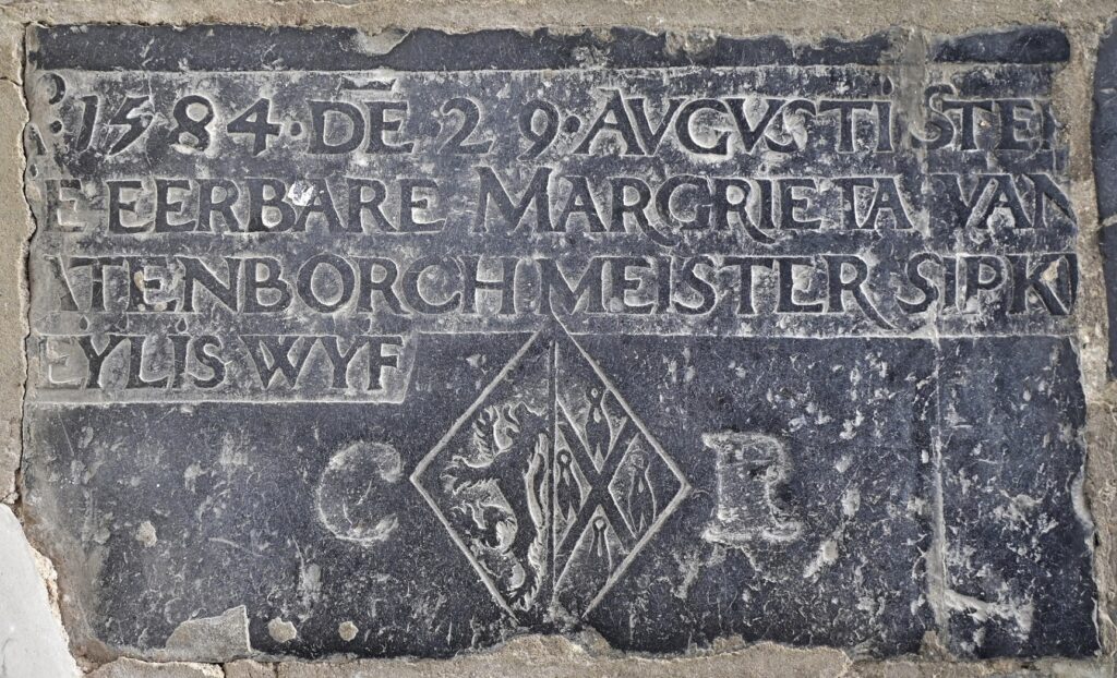 Zerk 106 De tekst is goed te lezen. Ook de versiering onder de tekst is nog gaaf. Ao 1584 den 29 Avgvstii Sterf de eerbare Margrieta van Batenborch meester Sipke .eylis wyf C R Tussen de letters C. R. is alleen een V schild aangebracht dat links van de deellijn een klimmende leeuw heeft en … Zerk 106