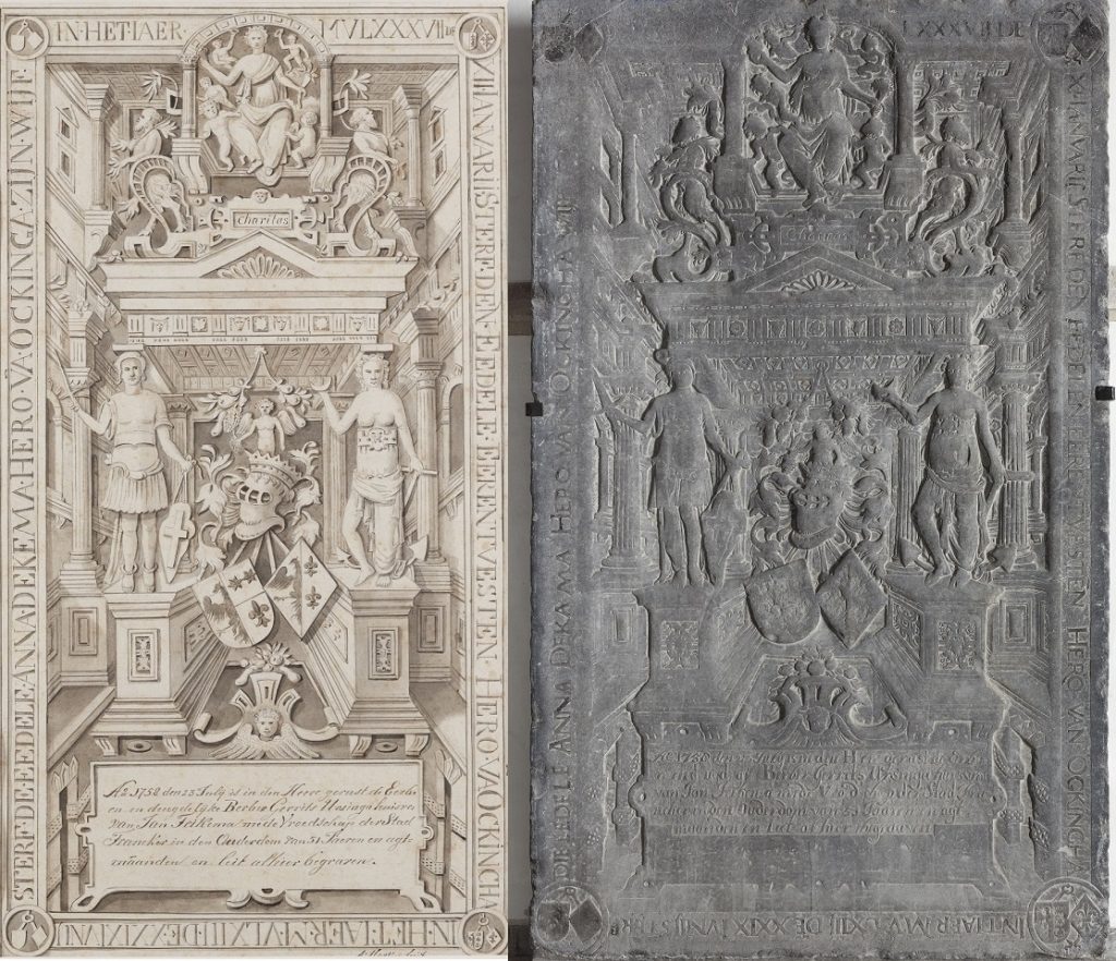 Zerk 107 Het randschrift is: Int iaer MVc LXXXVII den XII Ianuarij sterf den Eedele Eerentvesten Hero van Ockinga Int iaer MVc LXIII den XXIX Iuni sterf de Eedele Anna Dekema Hero van Ockinga sijn wijf Onder beeldhouwwerk in rechthoek staat: Ao 1758 den 23 Iuly is in den Heere gerust de’ Eer bare en Zerk 107