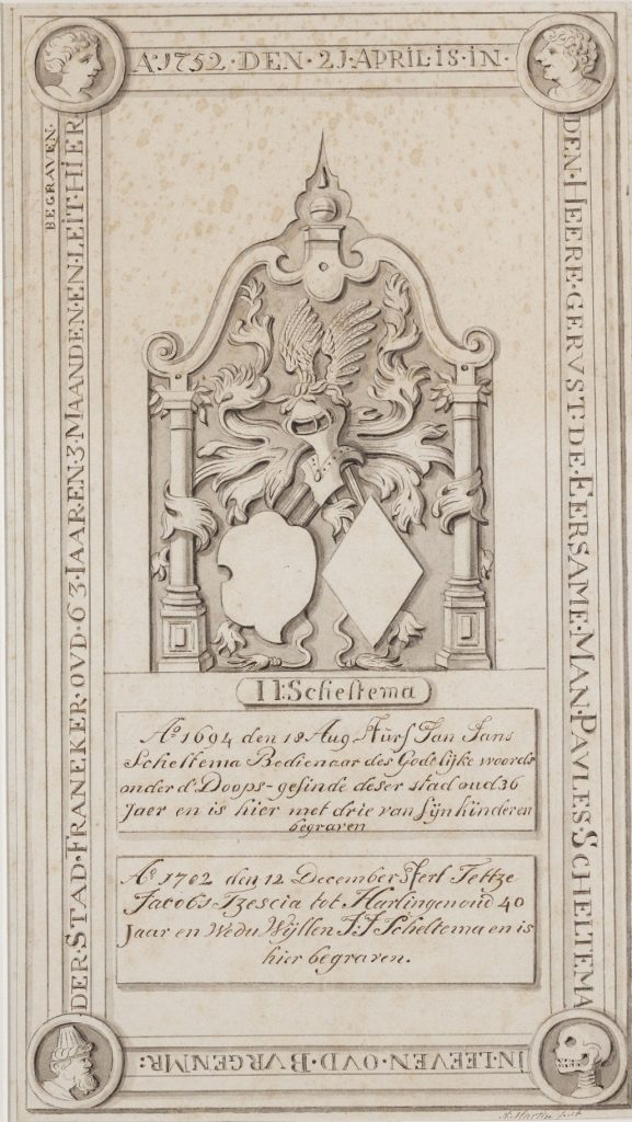 Zerk 110 De tekst is vrij goed leesbaar. Het grote fraaie beeldhouwwerk is deels afgesleten. In een kleine rechthoek staat de familienaam. De rest in 2 rechthoeken er onder. Randschrift is: Ao 1752 den 21 April is in den Heere gerust de Eersame Man Paulus Scheltema in leeven old Burgemr der Steede Franeker old 63 … Zerk 110