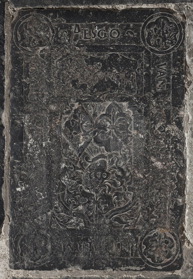 Zerk 114 Het is een klein, zogenaamd hoek- of bidsteen dat nogal beschadigd is, zowel de tekst als het beeldhouwwerk. Er zijn maar een paar woorden van het randschrift leesbaar. nt jaer M …… Aesgo’ van Hoxwier Het vermoeden is wel uitgesproken (Cannegieter) dat het hier een vroeg overleden kind van Esgo van Hoxwier (zerk … Zerk 114