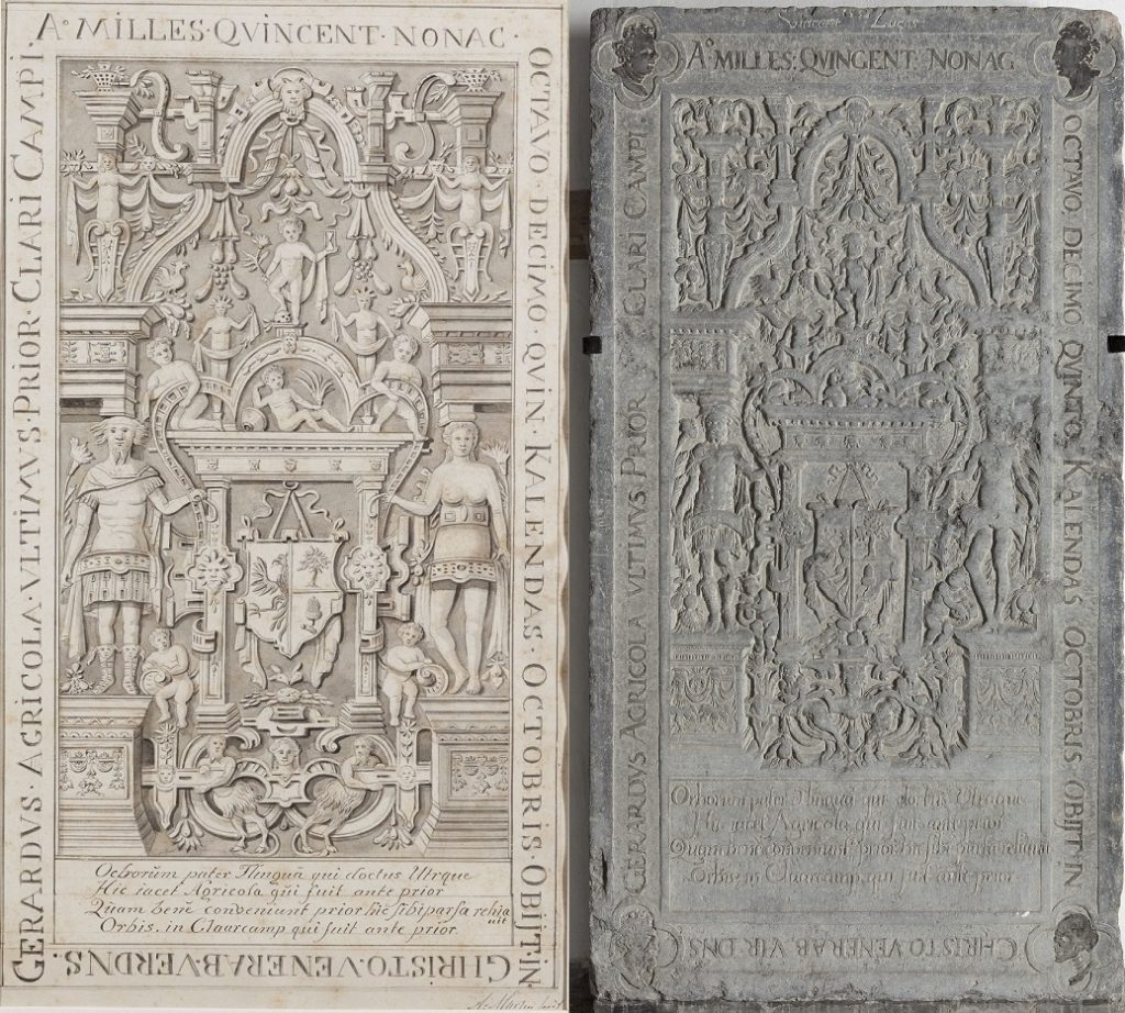 Zerk 117 Randschrift: Ao Milles Qvincent nonac octavo decimo qvinto kalendas Octobris obiit in Christo Venerab vir Dns. Gerardus Agricola vltimus Prior Clari Campo In het midden van de steen bovenste gedeelte een ongeschonden wapen, halve adelaar boven doorsneden met een boom en beneden een eikel aan een takje. In de vierpassen zijn de leeftijdskoppen … Zerk 117