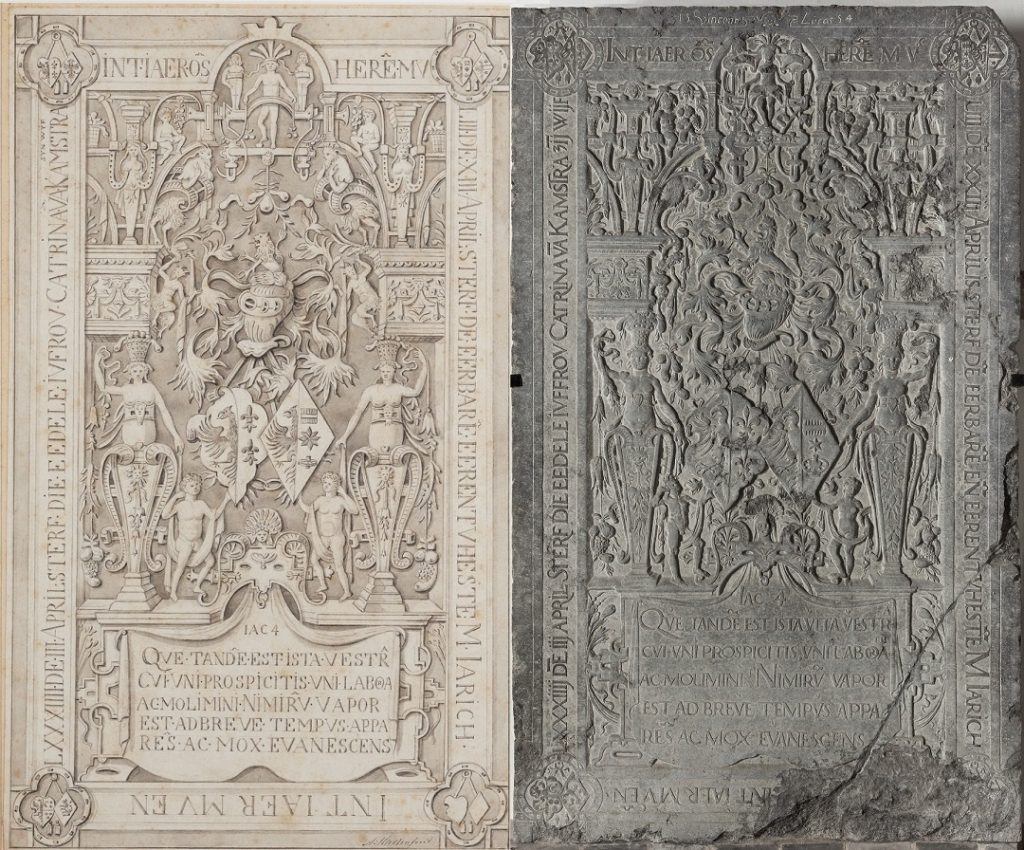 Zerk 121 Randschrift: Int Jaer o(n)s Here(n) MVcLIII de(n) XXIII Aprilis sterf de(n) eerbare(n) en(de) eerentvheste(n) M. JARICH VA(N) (DEKAMA). Int Jaer MVc en(de) LXXXIIII de(n) III April. sterf die eedele Juffrou CATRINA VA(N) KAMSTRA zij(n) wijf. Tekst onder: Jac. 4 Jac. 4 : 14 Que tande(m) est ista vita vestra Want gij zijt een … Zerk 121