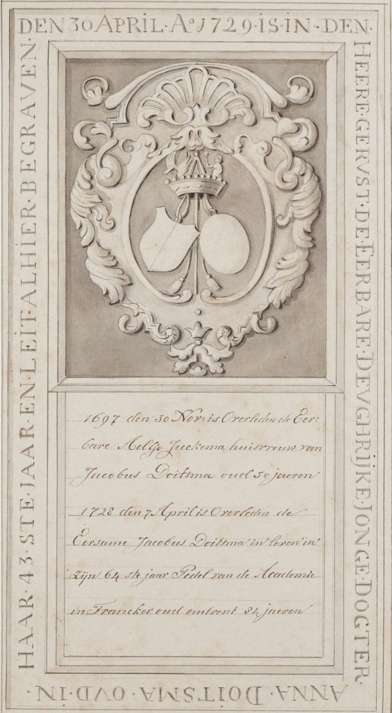 Zerk 123 Tekst randschrift: Den 30 april Ao 1729 is in den Heere gerust de Eerbare Deughtryke Ionge dogter Anna Doitsma oud in haar 43ste Jaar en leit alhier begraven Tekst onder beeldhouwwerk: 1697 den 30 November is overleden de Eer bare Aeltje Juckema huisvrouw va’ Jacobus Doitsma oud 59 jaeren 1728 den 7 April … Zerk 123