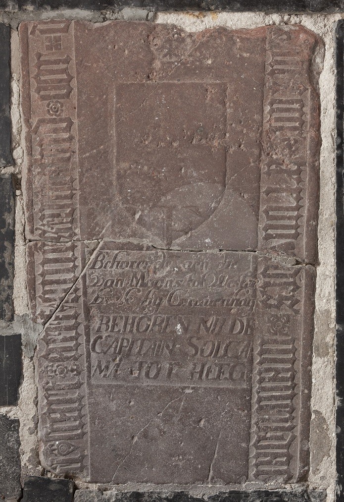 Zerk 133 Een oude rode Bremer zerk waarvan de boven en onderkant missen. Het randschrift is in oud gotisch schrift. Tekst randschrift is: ….. M CCCC LXXVII des Manendach ….. starf Aert Annes den bid vor die ziel Tekst middenvlak is: Behorende aen die van Moons tot Wester beek bij Gravenhage BEHOREM NU DIE CAPTEIN … Zerk 133