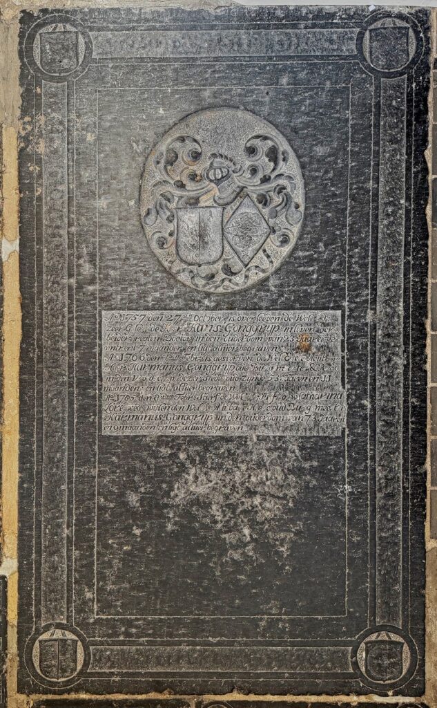 Zerk 136 Het oorspronkelijk randschrift van deze zerk is verwijderd, zowel van de buitenste als van de binnenste regel. Het middenvlak is buiten de aanwezige tekst, niet eerder gebruikt. De tekst onder het beeldhouwwerk is: Ao 1757 den 27 ste October is overleden de Wel ed: Zeer Geleerde Heer Hans Gonggrijp in leven der beider … Zerk 136
