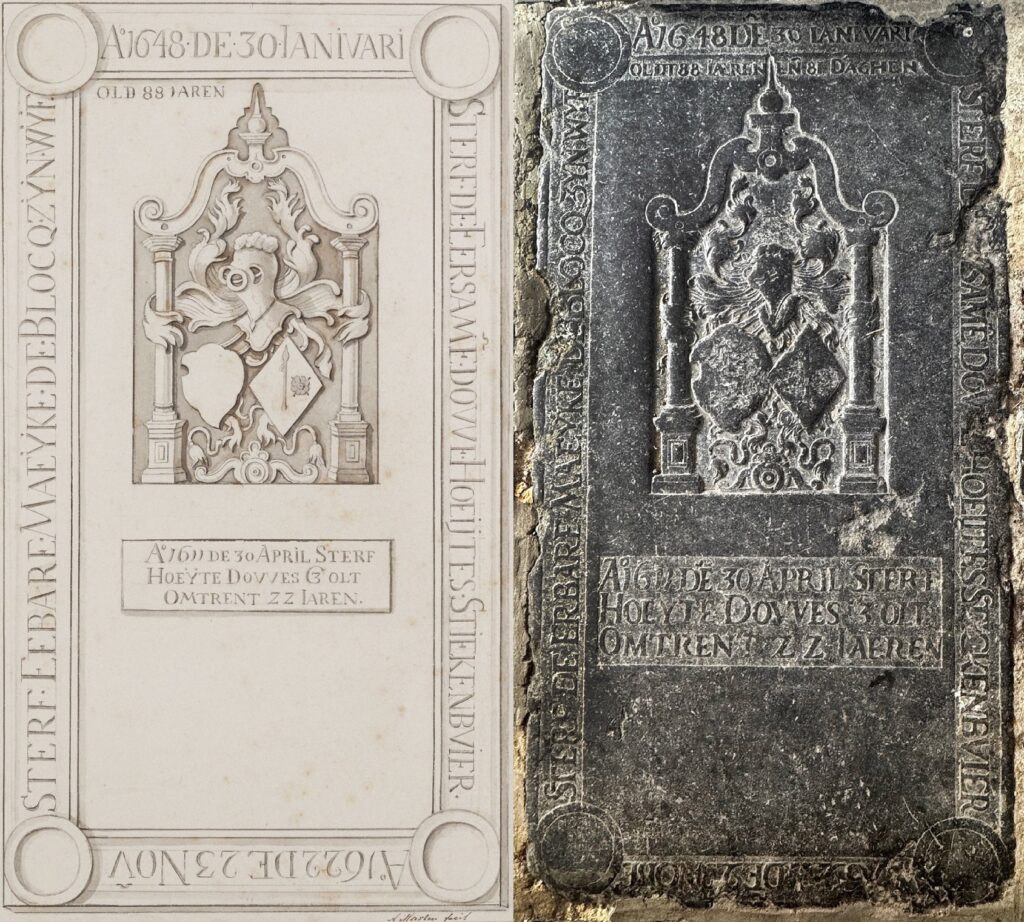 Zerk 140 De volgende zerk betreft Stickenbuier, een naam die al eerder op een zerk (zerk 90) in de zuiderbeuk vermeld wordt. Een deel van het randschrift staat in de binnenrand. Het randschrift is: Ao 1648 den 30 Ianiwari sterf de’ eersame Dovve Hoeijtes Stickenbuier oldt 88 Iaren en’ 81 Daghen Ao 1622 de’ 28 … Zerk 140