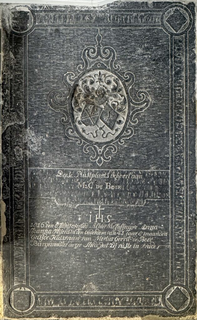 Zerk 142 De grote zerk betreft de familie De Boer. Tekst onder het beeldhouwwerk is: Dese rustplaat behoort aan M G de Boer + I H S 1816 den 8 junij overleed alhier MeJuffrouwe Anna Joanna Feijens in den ouderdom van 41 Jaar 8 maanden Geliefde Huisvrouw van Mevius Gerrit de Boer Burgemeester deezer Steede, … Zerk 142