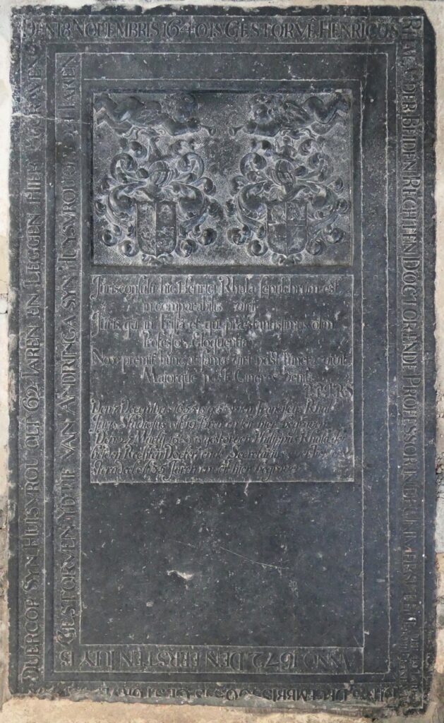 Zerk 151 Deze zerk heeft een fraai en eenvoudig beeldhouwwerk, waarvan de wapens zijn weggekapt. Het randschrift bestaat uit twee gedeeltes. Tekst buitenste rand is: Den 18 Novembris 1640 is Gestorve Henricus Rhala der Beiden Rechten Doctor ende Proffessor in de Universiteit tot Franeker olt 49 Iaren Den 5 Decembris 1665 is Gestorven Anna Duercop … Zerk 151