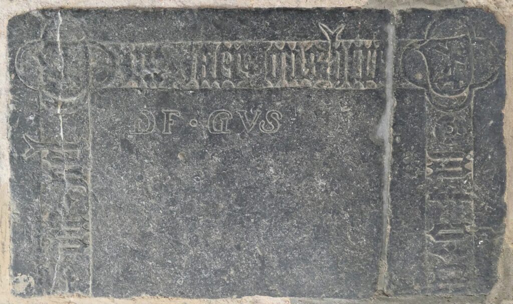 Zerk 153 Een oude zerk met gotisch randschrift. Het middenvlak is voorzien van de letters D F. G V S. deel randschrift is: int yaer ons here M D CC……… DF. G V S Op de hoeken in vierpassen een wapenschild met een huismerk. Foto van de Zerk: Gerrit de Vries, Franeker Fotoclub “De Zoeker”