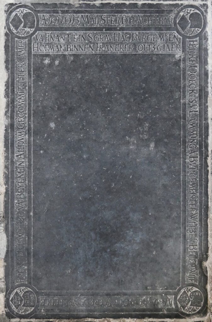 Zerk 158 Deze grote zerk bevat maar weinig tekst op het middenvlak. Van het randschrift is nog een behoorlijk deel leesbaar. De tekst is er wat eigenaardig op aangebracht. Het laatste deel van het randschrift is op het middenvlak geplaatst. Tekst van het randschrift is: Ao 1611 den 13 Maij sterf de E’ Achtbare Fedke … Zerk 158