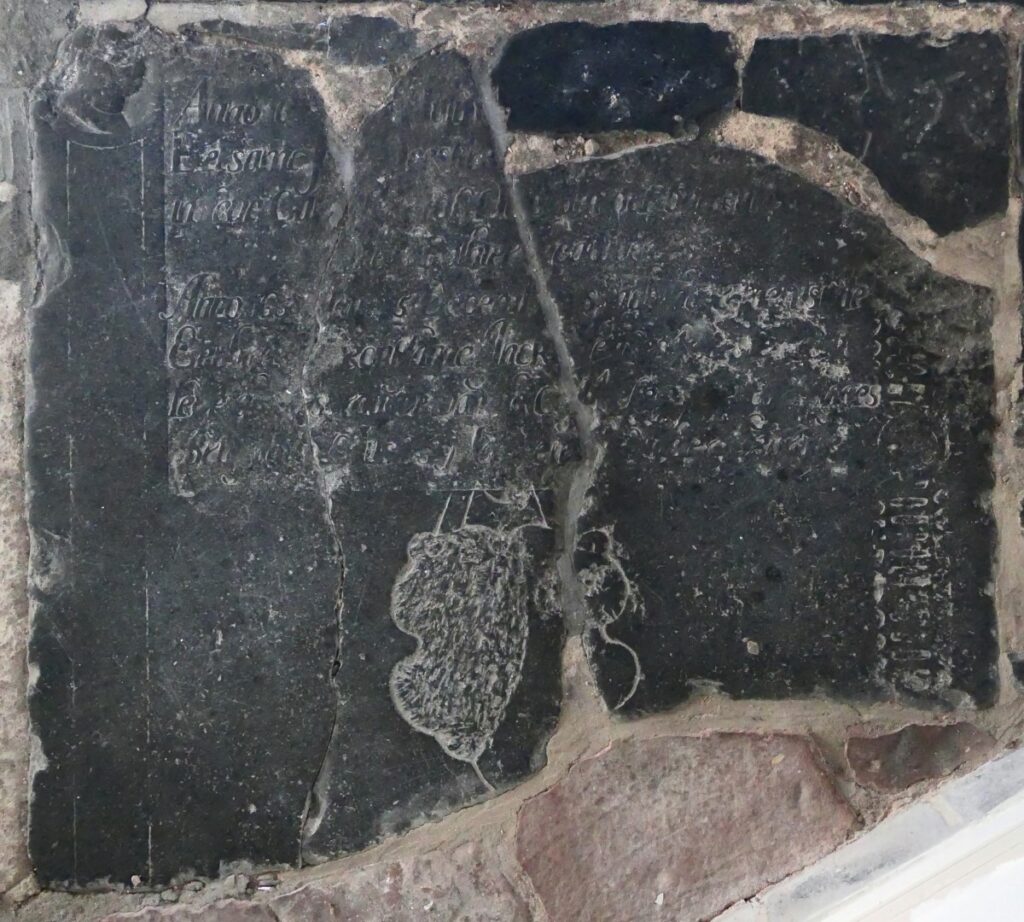 Zerk 159 Een zerk die nogal beschadigd is. Deel van de tekst is: anno 165. ….. junij ……………… eersame j…dees.r…………………. in leven cashier tot Hitzum out 66 jaer en leit alhier begraven anno 1655 den 5 desembris is in den heere gerust die eerbare ende deughtsame Jack de becker …….. leeven den cas………………….. wees ……… … Zerk 159