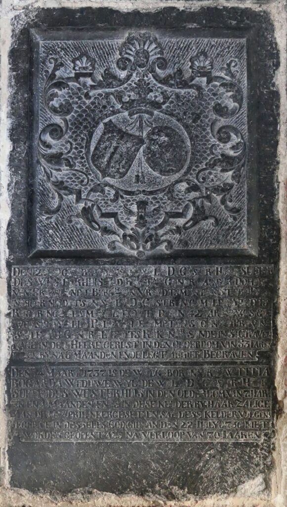 Zerk 161 De tekst van deze zerk is door het wegkappen van een aantal letters lastig te lezen. Het verwijderen van de letters en afbeeldingen op de wapens is na 1795 gebeurd. Tekst onder het beeldhouwwerk is: Den 22 Octob. 1731 is den Wel. Ed. Gestrenge Heer Suffri dus Westerhuis ald Rent. mr. Generaal der … Zerk 161