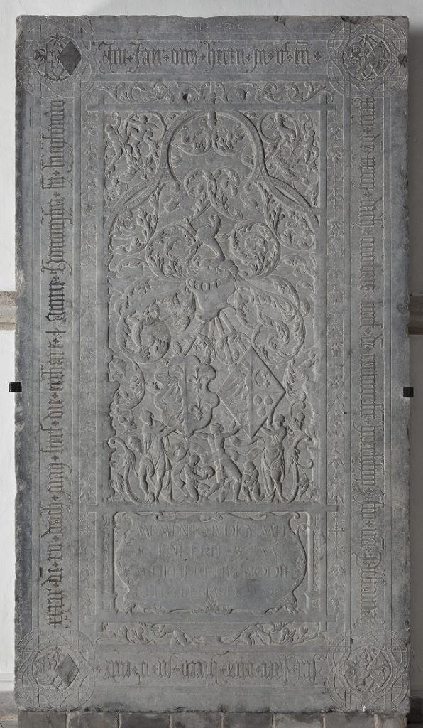 Zerk 163 Het randschrift in gotische letters is: Int jaer ons Heeren MVc ende XXIII den XXIIII dach Octobris sterf de eernveste heerschap Juw van Dekama Int jaer ons Heeren MVc end XXXIX (1539) de XV dach May sterf die eerbare Katrin Hottingha syn huysfrouw onder beeldhouwwerk staat een tekst uit “Ecclesiasticus”(Jezus Sirach), hst 38, … Zerk 163