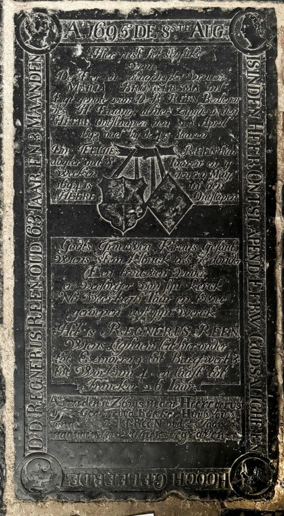 Zerk 165 Deze zerk is nog vrij gaaf van tekst en beeld. Het randschrift is: Ao 1695 de 8ste Aug is in den Heer Ontslapen d’ Eerw: Godsalighe en Hoogh Geleerde D.R. Regnerus Reen oud 63 Iaar en 3 maanden Op het middenvlak onder het beeldhouwwerk staat: Hier rust het stoflike van De Eer- en … Zerk 165