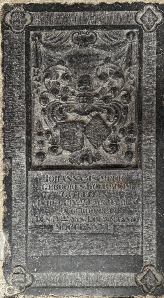 Zerk 166 Deze zerk is door de steenhouwer op deskundige wijze van een nieuwe tekst voorzien. Wat de oorspronkelijke tekst is geweest, is onbekend. Het beeldhouwwerk behoorde bij de eerdere gebruiker. De tekst onder het beeldhouwwerk is: JOHANNA CAMPER gebooren Bourboom overleden In het LIVste Iaar Haares Ouderdoms den IVden van Louwmaand MDCCLXXVI Johanna Camper-Bourboom … Zerk 166